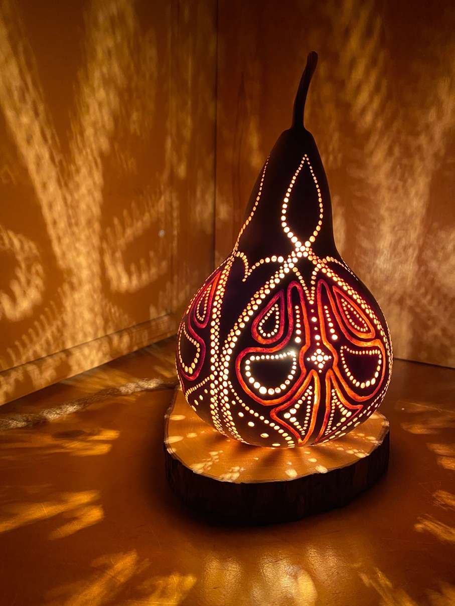 The start of each lamp is the start of a new journey. Each piece is unique and no lamp is ever the same. The process begins by looking at the shape of the gourd and seeing how it can come alive. Patterns, shapes and forms unfold and each project is an evolution of my imagination alongside consistently trying to improve my skills and techniques.